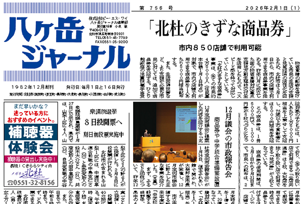 かぶりもの展 北杜市郷土資料館 2026.02.04 できごと webtoday WEBTODAY コガラ 2026.02.04 八ヶ岳自然散策 webtoday WEBTODAY 凍てつく森の通り道 2026.02.04 ズームアイ webtoday WEBTODAY 八ヶ岳ジャーナル2月1日号 2026.02.02 新聞 webtoday WEBTODAY 韮崎駅前で110番通報の適正利用を呼びかけ 2026.01.19 韮崎エリア webtoday WEBTODAY 八ヶ岳ジャーナル1月16日号 2026.01.16 新聞 webtoday WEBTODAY 「韮崎市二十歳のつどい」開催、人生の節目祝う 2026.01.16 韮崎エリア webtoday WEBTODAY 防火・防災への決意新たに、韮崎市消防団が出初式 2026.01.16 韮崎エリア webtoday WEBTODAY 市と商工会が合同で賀詞交歓会 2026.01.16 韮崎エリア webtoday WEBTODAY 韮崎ジャーナル1月号 2026.01.05 新聞 webtoday WEBTODAY 八ヶ岳ジャーナル1月1日号 2026.01.05 新聞 webtoday WEBTODAY 2026年 2026.01.01 くらし webtoday WEBTODAY 1234…487
