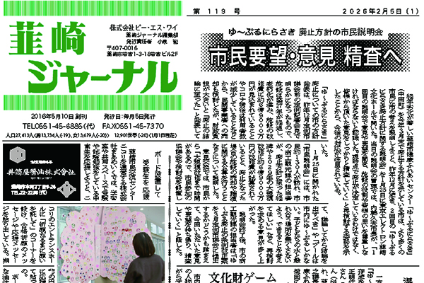 韮崎ジャーナル2月号 2026.02.05 新聞 webtoday WEBTODAY かぶりもの展 北杜市郷土資料館 2026.02.04 できごと webtoday WEBTODAY コガラ 2026.02.04 八ヶ岳自然散策 webtoday WEBTODAY 凍てつく森の通り道 2026.02.04 ズームアイ webtoday WEBTODAY 八ヶ岳ジャーナル2月1日号 2026.02.02 新聞 webtoday WEBTODAY 韮崎駅前で110番通報の適正利用を呼びかけ 2026.01.19 韮崎エリア webtoday WEBTODAY 八ヶ岳ジャーナル1月16日号 2026.01.16 新聞 webtoday WEBTODAY 「韮崎市二十歳のつどい」開催、人生の節目祝う 2026.01.16 韮崎エリア webtoday WEBTODAY 防火・防災への決意新たに、韮崎市消防団が出初式 2026.01.16 韮崎エリア webtoday WEBTODAY 市と商工会が合同で賀詞交歓会 2026.01.16 韮崎エリア webtoday WEBTODAY 韮崎ジャーナル1月号 2026.01.05 新聞 webtoday WEBTODAY 八ヶ岳ジャーナル1月1日号 2026.01.05 新聞 webtoday WEBTODAY 1234…487