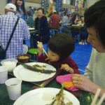 東日本大震災で被災した宮城県気仙沼市の復興を支援する「穴山町サンマ祭り」(同実行委員会主催)が、10月14日、穴山町ふれあいホールで開かれ、炭火で焼き上げる気仙沼産のサンマを味わおうと市内外から多くの人が訪れた。