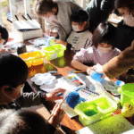 続いて、和紙製のだるま(高さ12㌢)に親子で協力しながらアクリル絵の具や水彩絵の具を使って色を塗ったり、顔を描き、緑や青、ピンクなどオリジナルのだるまを完成させた。