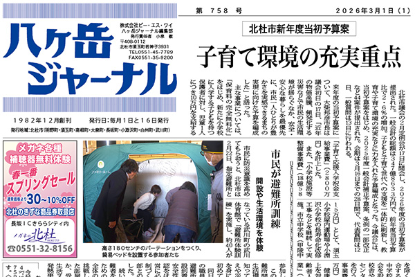 八ヶ岳ジャーナル 3月1日号 2026.03.03 新聞 webtoday WEBTODAY 「春のおとずれ」 2026.03.01 ズームアイ webtoday WEBTODAY 草食恐竜が食べていたかも知れないフサザクラ 2026.03.01 八ヶ岳自然散策 webtoday WEBTODAY 韮崎市が当初予算発表、定例記者会見 2026.02.27 韮崎エリア webtoday WEBTODAY 八ヶ岳ジャーナル2月16日号 2026.02.16 新聞 webtoday WEBTODAY 八ヶ岳高原文学賞 2026.02.16 できごと webtoday WEBTODAY 第51回衆議院議員選挙開票速報 2026.02.08 くらし webtoday WEBTODAY 韮崎ジャーナル2月号 2026.02.05 新聞 webtoday WEBTODAY かぶりもの展 北杜市郷土資料館 2026.02.04 できごと webtoday WEBTODAY コガラ 2026.02.04 八ヶ岳自然散策 webtoday WEBTODAY 凍てつく森の通り道 2026.02.04 ズームアイ webtoday WEBTODAY 韮崎駅前で110番通報の適正利用を呼びかけ 2026.01.19 韮崎エリア webtoday WEBTODAY …1234…348